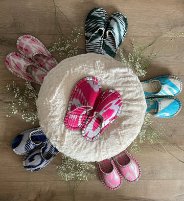 Our Ikat slippers combine traditional Uzbek craftsmanship with modern comfort. Made from high-quality cotton and dyed with the signature blurred Ikat technique, they feature a durable outdoor sole for stability. Available in rich color variations, some designs include soft faux fur for added warmth. Perfect for both indoor and outdoor wear, these slippers offer artisanal beauty and everyday ease.